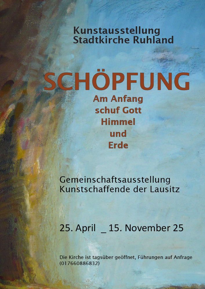 Was im Jahr 2019 mit einer Aktion in der (noch nicht renovierten) Kirche in Hermsdorf bei Ruhland begann, findet in diesem Jahr seinen ganz besonderen Widerhall: Bilder zum großen Thema SCHÖPFUNG, geschaffen von mehr als 15 Kunstschaffenden der Region werden ab dem 25. April in der Stadtkirche Ruhland gezeigt.